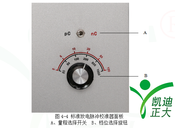 标准放电脉冲校准器提供20pC~100nC共十二档标准放电脉冲,量程调节面板如图4-4所示。使用时,首先通过量程选择开关选择pC或nC量程,然后通过档位选择旋钮选择相应的档位。当量程选择开关处于“pC”位置时,档位选择读数为内圈(黑色)刻度,单位为pC;当量程选择开关处于“nC”位置时,档位选择读数为外圈(红色)刻度,单位为nC。