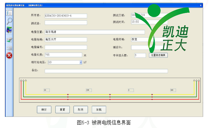 运行KD-OWTS测试系统软件,点击“被测电缆信息”图标,进入被测电缆信息界面,如图5-3所示,软件提供友好的输入界面,现场试验时应根据软件提示,填入实际试验电缆的相关信息,填完后按确认保存。此界面共有四个按钮,功能如下
