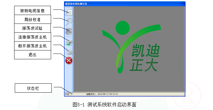 测试系统启动界面如图5-1所示,软件启动时,会自动连接振荡波主机,如连接成功,“连接振荡波主机”按钮变灰,“断开振荡波主机”按钮变亮,同时状态栏会有连接成功的提示。正常试验时,首先应确认振荡波主机连接状态正常,然后依次进行被测电缆信息输入、局放校准和振荡波试验等操作,现场试验相关详细操作详见第6章。