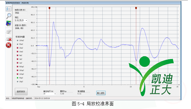 在测试软件界面中点击“局放校准”图标,进入局放校准界面如图5-4所示,局放校准界面提供20pC~100nC共12档量程的局放校准,对被测电缆进行校准时,应和标准放电脉冲校准器的量程一一对应。现场振荡波试验时,必须对电缆进行校准。