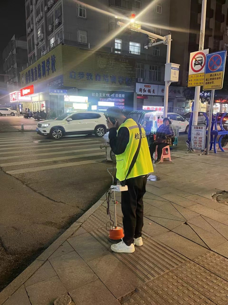 我们到达负责人许队给的位置,与许队碰面后,许队带我们熟悉现场情况和电缆大致埋过去的路线。这条电缆一端连在配电房另一端连在塔杆上。电缆顺着马路边一路埋过去的,中间经过马路。两端电缆都连着,没有解开。看到这情况后,让许队安排电工解开电缆两端。