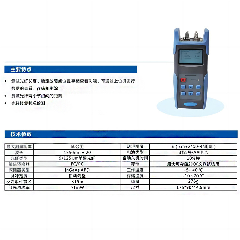 ①:最大探测距离60km是指,在动态范围内60km处可探测到>1dB的反射事件;非反射事件的探测距离为40km(>1dB)。