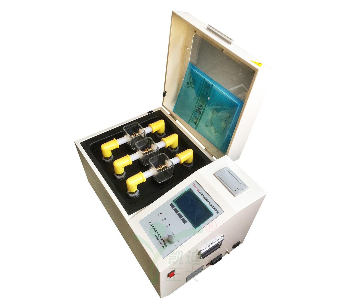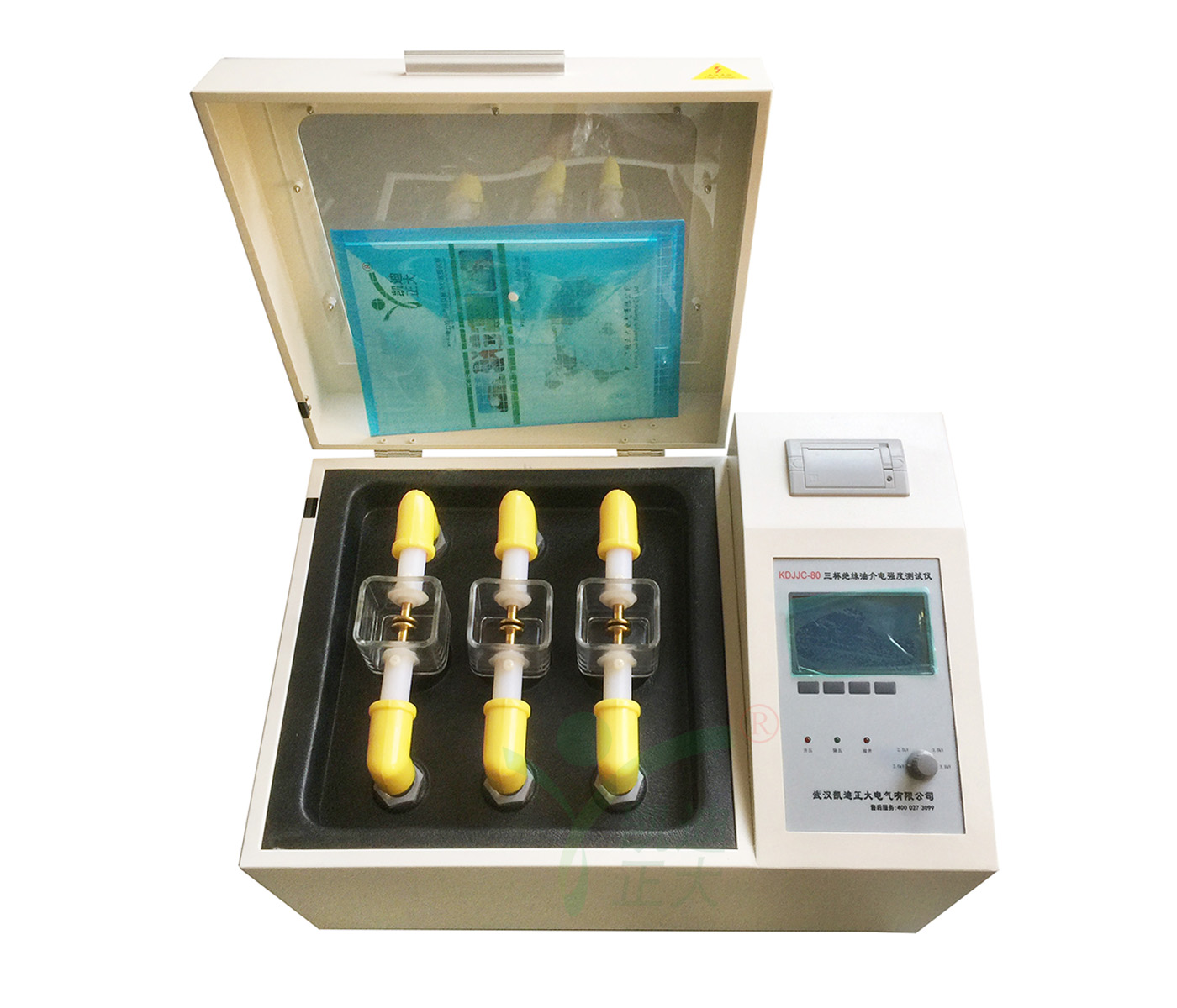 KDJJC-80 自动绝缘油介电强度测试仪(三杯同测)具有数据处理功能:可记忆以往的500次测试结果,用户自定义四套标准检验程序,您可以根据工作需要选择一个标准的检验程序对试样进行测试。由于我公司使用的是“SLX 试杯”结构,可通过调整试杯两侧的旋动机构来微调电极间距,不但调整方便,而且精度很高。用户在调整电极间距时,“方便”、“准确”、“快捷”。