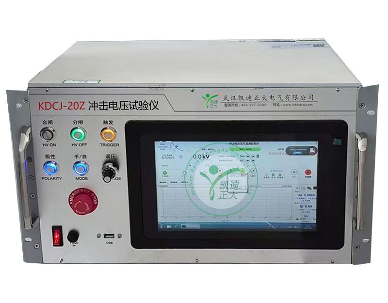 KDCJ-20Z触摸屏智能冲击耐压测试仪用于各类电力设备进行雷电冲击电压全波试验,检验设备的绝缘性能。输出波形1.2±30%/50±20% μs标准雷电冲击电压全波,效率大于90%,过冲小于5%;测量模块整合了符合IEC标准的波形评估算法,能够自动计算并显示波形参数。